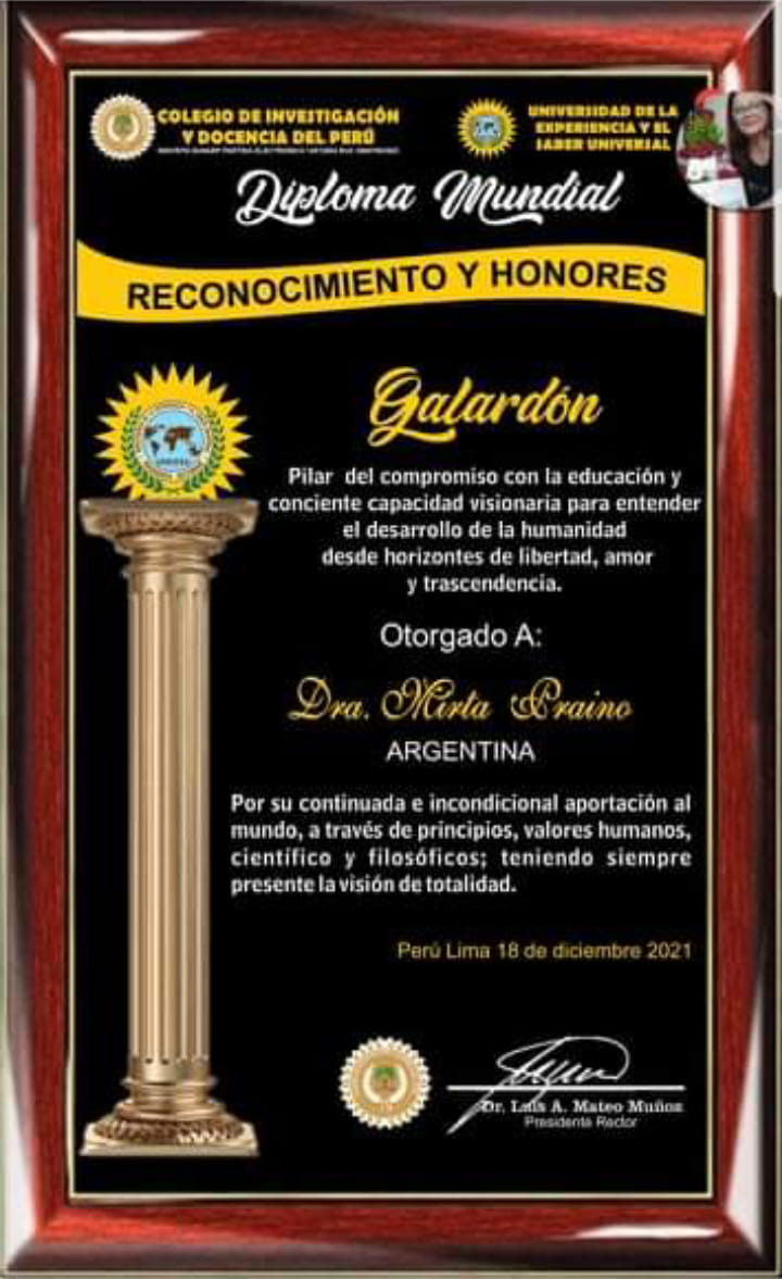 Mirta Praino en la Cumbre Virtual por la Paz Internacional 2020 Recibe la Medalla de la Paz